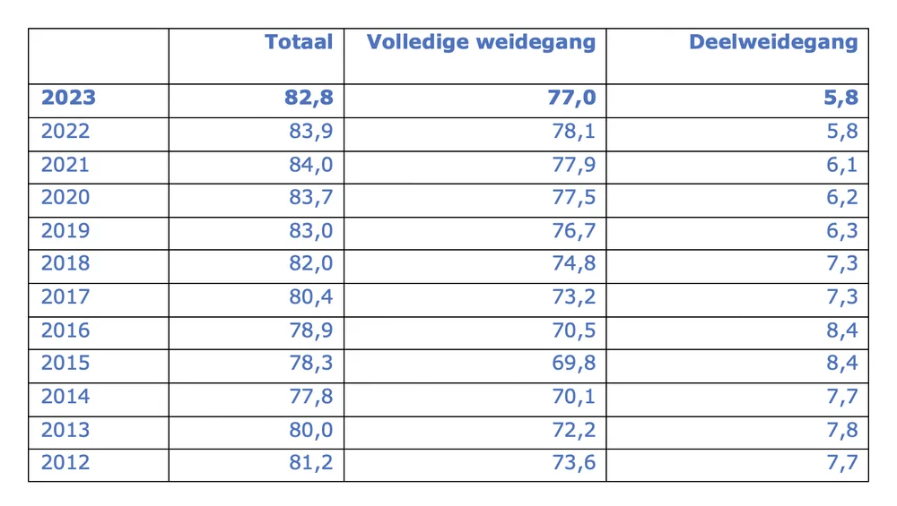 Het aandeel bedrijven met volledige weidegang nam in 2023 af tot 77,0%, in 2022 was dit aandeel nog 78,1%. Dit wijst erop dat in alle bedrijfsmatige afwegingen die melkveehouders moeten maken, ook in relatie tot hun duurzaamheidsscore, weidegang in 2023 iets minder prioriteit heeft gekregen. Het aandeel deelweidegang bleef stabiel met 5,8%.