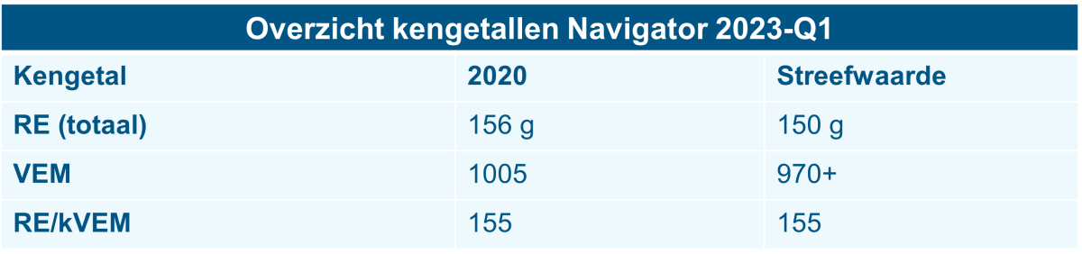 En deze aanpak lijkt te werken! In het eerste kwartaal van 2023 blijkt uit de cijfers van de Navigator dat het RE-gehalte van het rantsoen (inclusief jongvee) daalde tot maar liefst 156 g. Ook het kengetal RE/kVEM zakte, tot 155 (zie tabel 3).