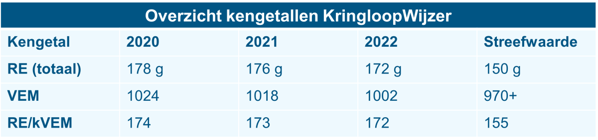 Jan Willem startte zijn deelname aan het Netwerk met een RE-gehalte in het rantsoen van 178 g en een RE/kVEM verhouding van 174 in 2020 (het referentiejaar). De reductie-aanpak van Netwerk Praktijkbedrijven streeft naar een RE-gehalte in het rantsoen van 150 g en een RE/kVEM verhouding van 155. Vanwege het startpunt van 178 g RE lijkt de potentie van voermaatregelen voor melkveebedrijf Mandeveld groot. De afgelopen periode ging Jan Willem met de Netwerk-aanpak aan de slag. Dit zorgde voor een verlaging tot 172 g in 2022, voor zowel het RE-gehalte als de RE/kVEM verhouding. Zie tabel 1 voor een overzicht van de kengetallen.