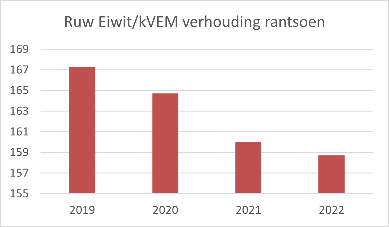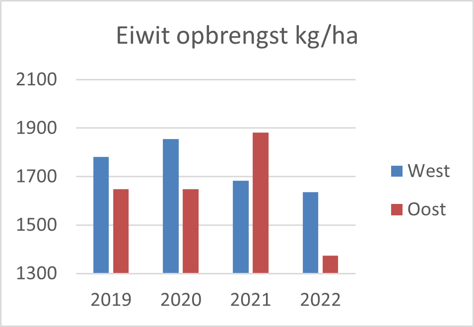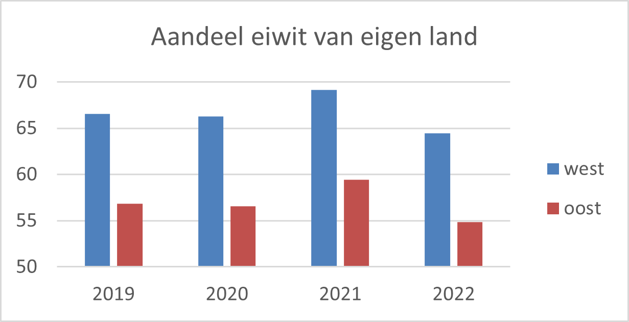 te verhogen. En 2022 laat zelfs het laagste aandeel EEL zien voor zowel de groep west als die in oost. En 2021 was het jaar met het hoogste aandeel eiwit van eigen land.