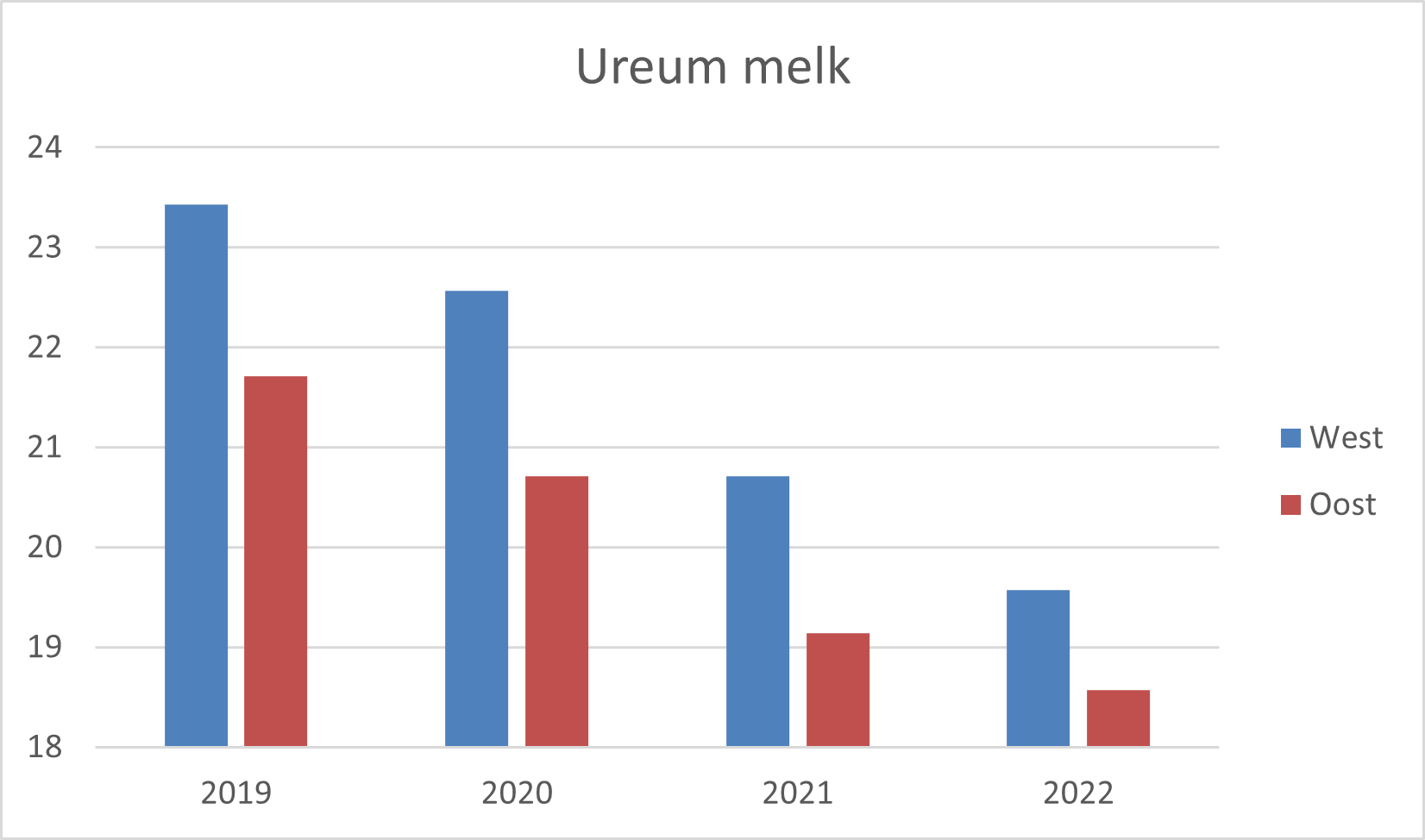 Naast het sturen op meer eiwit productie van eigen land, is duidelijk gewerkt aan het scherper sturen op eiwit in het rantsoen. Daarbij was het ureum in de melk de graadmeter om ook lager durven gaan. Figuur 4 laat het dalende ureum verloop van 2019 t/m 2022 goed zien. Het verschilt per veehouder hoe strak er wordt gestuurd en welke grens wordt opgezocht. Toch zeggen ook de deelnemers die niet veel aanpassingen hebben doorgevoerd na 4 jaar anders tegen het ureum aan te kijken en minder snel de eiwitkraan open te trekken bij een lager ureum dan voorheen. . Dit werd ook gestimuleerd door de hoge krachtvoerprijzen en een voorjaarskuil van 2021 met weinig eiwit. Maar de deelnemers aan HME laten zien dat sturen op ureum mogelijk is. Vooral in het groeiseizoen zijn belangrijke stappen gezet door te kiezen voor energierijke bijvoeding op stal met laag eiwit, naast het voeren van vers gras d.m.v. weidegang of zomerstalvoeren. Door naast eiwitrijk vers gras, eiwitarmer kuilgras en/of snijmais in de zomer en najaar te voeren, en eiwitrijkere kuilen te bewaren voor het winterseizoen, is de eiwitbenutting met name in deze periodes omhooggegaan en het ureum naar beneden. Daarnaast werd vroegtijdig gestuurd op het verlagen van eiwit in het krachtvoer wanneer de koeien weer naar buiten gingen.