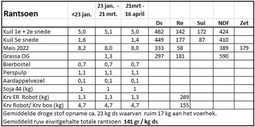 De gehalten van de herfstkuil per kg ds waren 974 VEM, een RE van 177 met een OEB van 75. De ontsloten graskuil had een geschatte VEM van 900, een RE van 177 gram/kg ds met een OEB van 10. In onderstaande tabel zijn de gevoerde rantsoenen voor, tijdens en na de proef weergegeven.