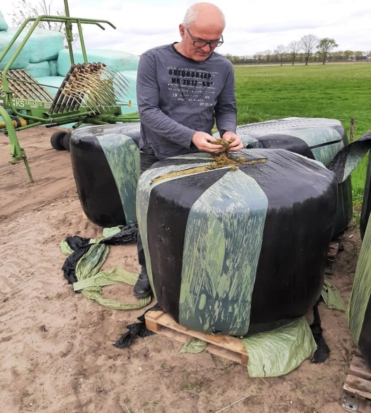 De ontsloten graskuil voor deze proef is aangeleverd door Grassa; de fabriek kan nog niet op grote schaal gras van veehouders verwerken. Het betrof gras van verschillende partijen, gemiddeld lag het RE van het verse grasrond de 22%. Het product is aangeleverd in ronde wikkelbalen van 450kg. Het geleverde product had een RE van 180 gram/kg ds; relatief hoog ten opzichte van het gemiddelde van ca. 150 gram/kg ds wat het afgelopen jaar door Grassa gemeten is. Het bedrijf is nog volop bezig het ontsluitingsproces te optimaliseren.