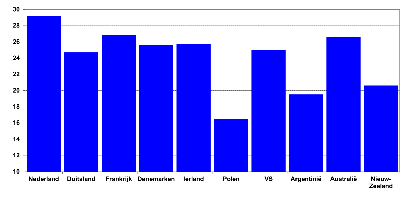 Melkkoeien op herkenbare Nederlandse melkveebedrijven realiseren gemiddeld een levensproductie van ongeveer 29.000 kg melk/koe. Dat is de totale hoeveelheid geleverde melk per koe bij afvoer. Figuur 1 laat duidelijk zien dat dit ten opzichte van andere belangrijkste zuivellanden de hoogste levensproductie is.