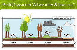 Het idee is de voordelen van weidegang maximaal te benutten bij alle weersomstandigheden en geen stal. Snel in het voorjaar starten met beweiden op bijvoorbeeld wintergranen, in de zomer bij mooi weer op gras, in de herfst bij slecht weer koeien gelegenheid geven te weiden op hoge percelen of op percelen met verstevigde bodem en in de winter op een zogenaamd ‘outwinter pad’ (gedraineerde bodem) bijvoeren.