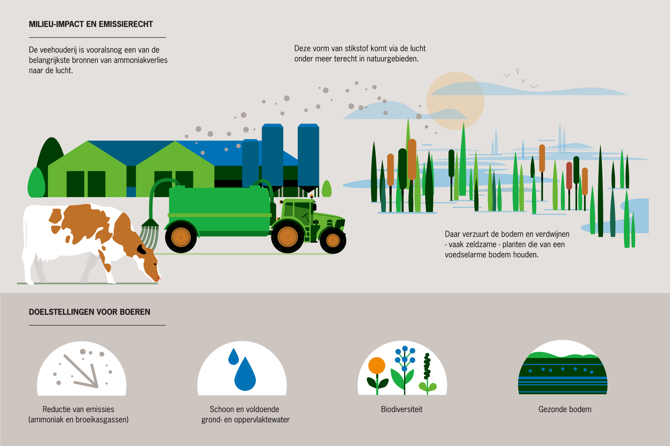 De landbouw staat voor grote opgaven. Boeren moeten voldoende gezond voedsel produceren en tegelijkertijd bijdragen aan het verbeteren van de leefomgeving, zoals de biodiversiteit, de water- en bodemkwaliteit en het klimaat. De veehouderij is vooralsnog een van de belangrijkste bronnen van ammoniakverlies naar de lucht. Ammoniak, een verbinding van stikstof en waterstof, ontstaat wanneer dieren eiwitten eten en hun mest en urine zich mengen. Deze vorm van stikstof komt via de lucht onder meer terecht in natuurgebieden. Daar verzuurt de bodem en verdwijnen, vaak zeldzame, planten die van een voedselarme bodem houden. Dit treedt op grote schaal op in veerijke provincies zoals Gelderland, Noord-Brabant, Limburg, Overijssel, Drenthe en Utrecht.