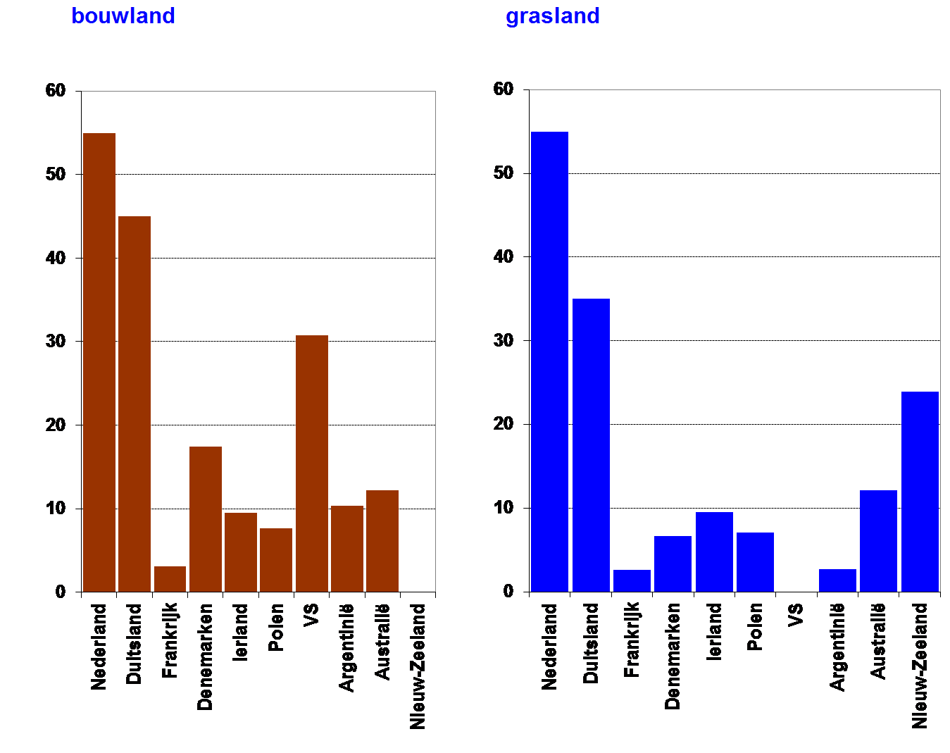 De grondprijzen in andere Europese landen liggen fors lager dan de gemiddelde grondprijzen in Nederland. Een Nederlands melkveebedrijf betaalt ongeveer € 55.000 per hectare voor gras- of bouwland. De prijs voor bouwland van een typisch Duits melkveebedrijf komt hier nog het meest in de buurt. De Duitse ondernemers betalen gemiddeld € 45.000 per hectare. De grondprijzen in andere Europese liggen gemiddeld ruimschoots beneden de € 20.000 per hectare. Zo ligt de waarde van een hectare landbouwgrond op een typisch Frans melkveebedrijf rond de € 3.000 per hectare.