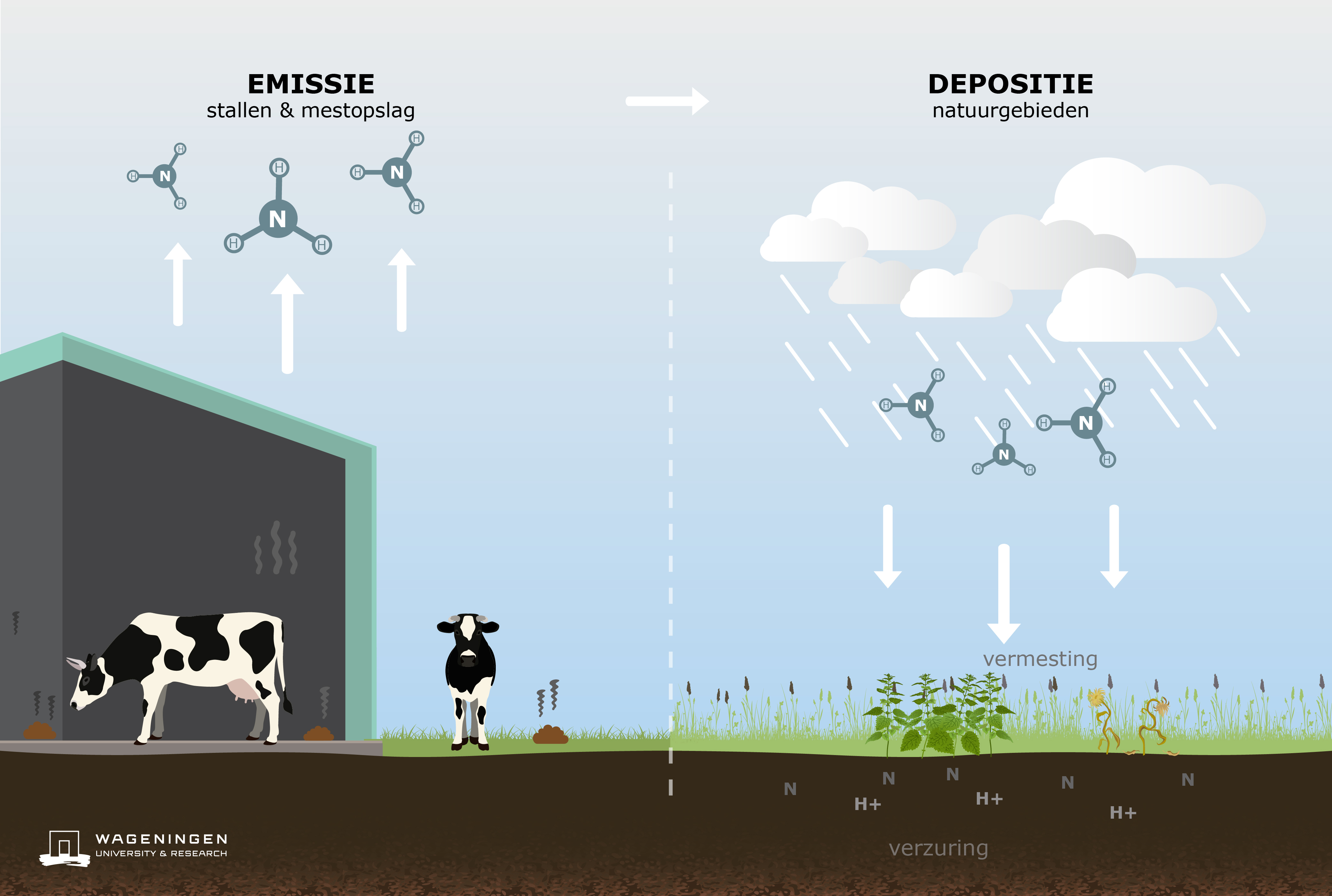 Stikstof in de veehouderij leidt tot ammoniak (NH3) in de lucht. Ruim 80% van de ammoniakuitstoot in Nederland komt uit de landbouw en met name uit mest. Ammoniak ontstaat wanneer een dier eiwitten heeft gegeten en mest en
