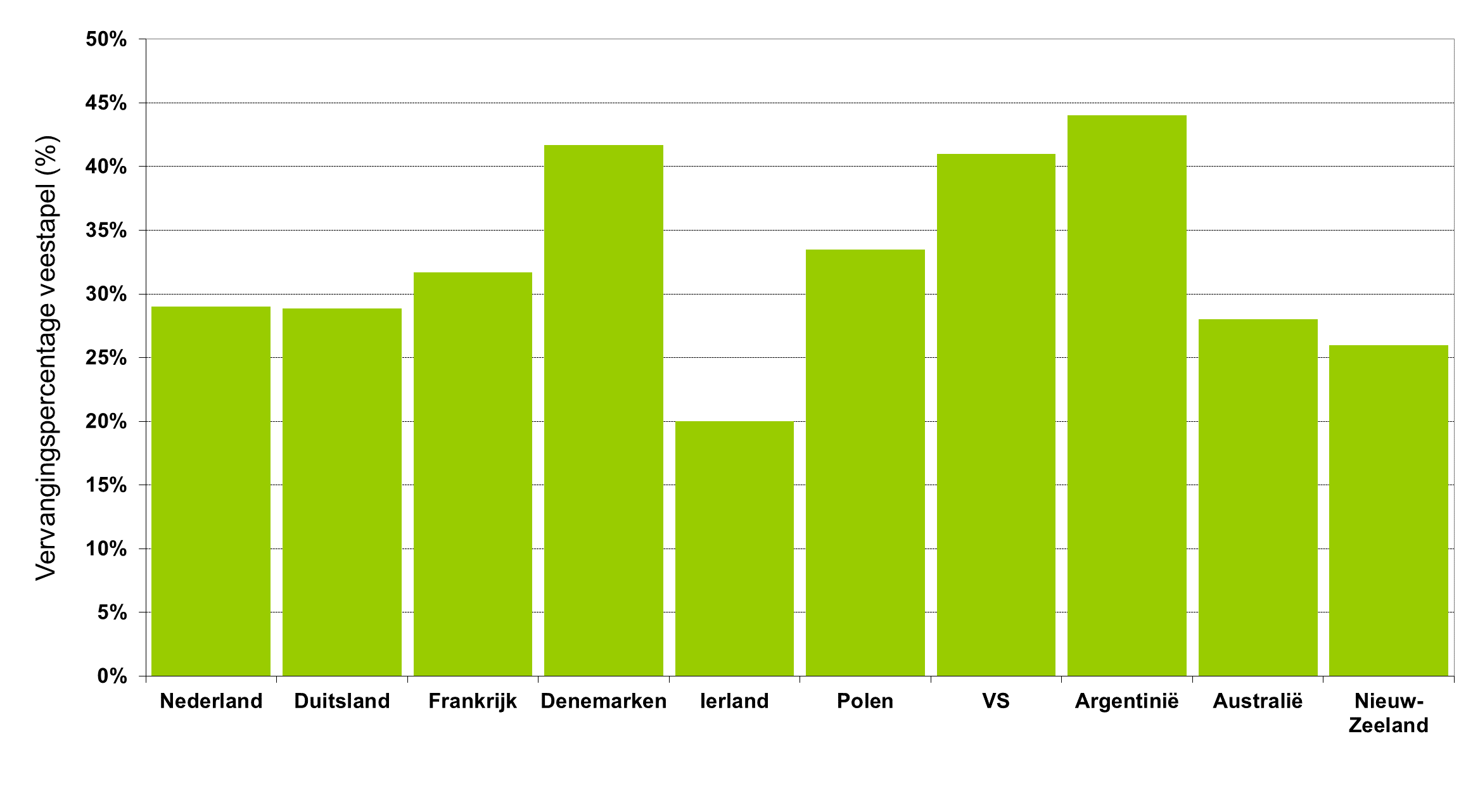Het vervangingpercentage op een gemiddeld melkveebedrijf was in 2016 29 procent. Met dit percentage is het Nederlands melkveebedrijf vrij gemiddeld ten opzichte van andere belangrijke zuivellanden. Het vervangingspercentage bij de Duitse veehouders ligt op een vergelijkbaar niveau. Het typische Franse bedrijf zit met 31% net iets hoger. Binnen Europa is de jaarlijkse vee-vervanging op Deense bedrijven hoog met meer dan 40%. Op het typische Ierse melkveebedrijf gaan de koeien veel langer mee: ongeveer 20% van de veestapel wordt jaarlijks vervangen.
