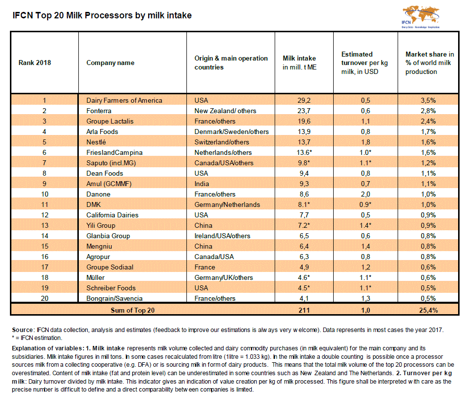 Nieuwe resultaten van IFCN Top 20 melkverwerkerslijst 2018 laten zien dat 25,4% van de geproduceerde melk wereldwijd wordt verwerkt door de 20 grootste zuivelreuzen. Deze twintig zuivelondernemingen verwerkten in 2015 nog 200 miljoen tot melk. Dit is in 2017 gestegen naar 211 miljoen ton. Net als de ranglijst van 2016 voert Dairy Farmers of America in 2018 weer de lijst aan. Zij nemen jaarlijks 29,2 miljoen ton melk in. Dat is 3,5 procent van de totale melkproductie in de wereld. Ook de Nieuw-Zeelandse Fonterra en de Franse Groupe Lactalis hebben in 2018 hun positie, respectievelijk 2 en 3 plek, ten opzichte van de ranglijst in 2016 behouden.