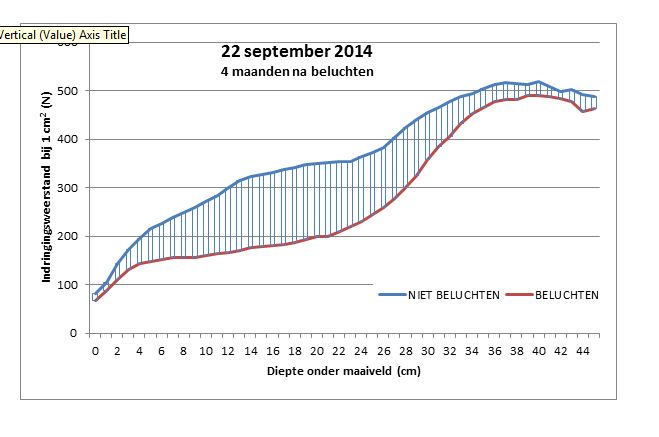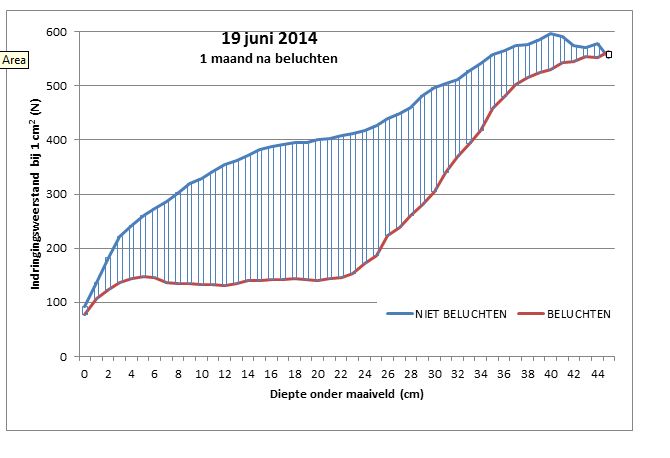 Uit meting van de indringingsweerstand blijkt dat de graslandbodem vier maanden na beluchten nog steeds los is. Wel neemt het verschil tussen beluchten en niet-beluchten duidelijk af na vier maanden vergeleken met de situatie na één maand. De bodem zakt namelijk weer in door natuurlijke bezakking en berijding met machines. De graslandbeluchting, gecombineerd met doorzaai, werd in mei uitgevoerd met een graslandwoeler.
